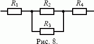 Найдите общее напряжение и напряжение на каждом резисторе (рис. 8), если сила тока на третьем резисторе равна 2 А, а сопротивления четырех резисторов соответственно равны 2 Ом, 10 Ом, 15 Ом и 4 Ом.