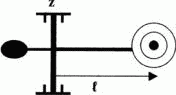 Пуля массой m = 5 г летит горизонтально со скоростью v = 800 м/с и попадает в центр мишени крутильно-баллистического маятника, момент инерции Jz которого равен 0,025 кг·м2. Мишень выполнена таким образом, что пуля застревает в ней. Определить начальную угловую скорость ω маятника, если расстояние l от оси z до центра мишени равно 0,5 м.