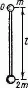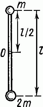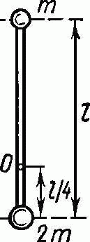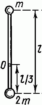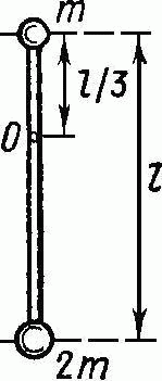 На концах тонкого однородного стержня длиной l и массой 3m прикреплены маленькие шарики массами m и 2m. Определить момент инерции J такой системы относительно оси, перпендикулярной стержню и проходящей через точку О, лежащую на оси стержня. При расчетах принять l = 1 м, m = 0,1 кг. Шарики рассматривать как материальные точки.