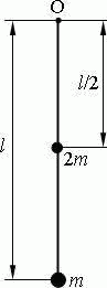 Физический маятник представляет собой тонкий однородный стержень массой m с укрепленными на нем двумя маленькими шариками массами m и 2m. Маятник совершает колебания около горизонтальной оси, проходящей через точку О на стержне. Определить частоту ν гармонических колебаний маятника для случаев, изображенных на рисунке. Длина l стержня равна 1 м. Шарики рассматривать как материальные точки.