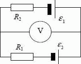 Батареи имеют э.д.с, ε1 = ε2, сопротивления R1 = R2 = 100 Ом, сопротивление вольтметра Rv = 150 Ом. Показание вольтметра U = 150 В. Найти э.д.с. ε1 и ε2 батарей.