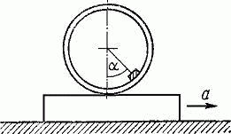 На плоской горизонтальной поверхности находится обруч, масса которого ничтожно мала. К внутренней части обруча прикреплен груз малых размеров, как это показано на рисунке. Угол α = 30°. С каким ускорением а необходимо двигать плоскость в направлении, указанном на рисунке, чтобы обруч с грузом не изменил своего положения относительно плоскости? Скольжение обруча по плоскости отсутствует.