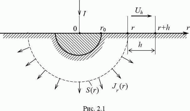 Провод заземления подсоединен к металлической полусфере, погруженной в землю (рис. 2.1). Заданы: удельная электропроводность земли γ, радиус полусферы r0 и значение тока I короткого замыкания в проводе заземления (табл. 2.1). Требуется: 1) получить (вывести, доказать, обосновать) каждое из приведенных ниже соотношений (2.1)—(2.7); 2) рассчитать и построить графики изменения от координаты r напряжения U(r) на поверхности земли и шагового напряжения Uh(r); на осях указать размерности соответствующих величин; расчеты выполнить для точек r = r0, r0 + h/2 , r0+h , r0+3h/2 , r0+2h, r0+3h, r0+5h, r0+7h, r0+10h, считая, что расстояние шага равно h = 80 см.