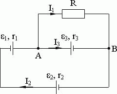 С использованием правил Кирхгофа, найти силы токов на всех участках цепи и разность потенциалов между узлами. В задаче известно: ε1 = 2,5 В, ε2 = 2,2 В, ε3 = 3,0 В, r1 = r2 = r3 = 0,2 Ом, R = 4,7 Ом.