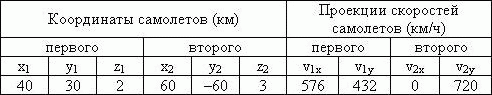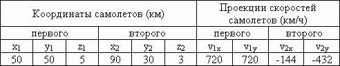 У диспетчера аэропорта к моменту начала дежурства (20 ч 00 мин 00 с) имеется информация о движении двух самолетов, приведенная в таблице 1.1. Используемая в ней система координат имеет начало в точке размещения диспетчера, ось 0х направлена на восток, а ось 0у - на север. 1. Отметьте на координатной плоскости 0xy положения воздушных судов и направления их полетов. 2. Запишите законы движения самолетов. 3. Определите время вылета одного из самолетов из аэропорта. 4. Определите минимальное расстояние, на которое сближаются самолеты, и время, когда произойдет сближение. 5. Найдите модуль скорости первого самолета в системе отсчета, движущейся вместе со вторым самолетом. Скорости самолетов считать неизменными. Размерами аэропорта пренебречь.