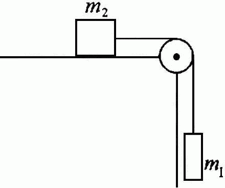 Грузы одинаковой массы (m1 = m2 = 0,5 кг) соединены нитью и перекинуты через невесомый блок, укрепленный на конце стола. Коэффициент трения груза m2 о стол µ = 0,15. Пренебрегая трением в блоке, определить: а) ускорение, с которым движутся грузы; б) силу натяжения нити.