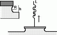 Круглая стеклянная пластина прикасается к воде (см.рис.). Ее тянут кверху посредством пружины L. Принимая для простоты расчета, что радиус кривизны R на высоте h/2 равен h/2, и пренебрегая второй кривизной боковой поверхности воды над пластиной, рассчитать силу, с которой натянута пружина L, при отрыве воды от пластины с площадью сечения 20 см2.