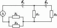 Две батареи аккумуляторов с ЭДС ε1 = ε2 = 100 В и четыре резистора с сопротивлениями R1 = 20 Ом, R2 = 10 Ом, R3 = 40 Ом и R4 = 30 Ом соединены, как показано на рисунке. Найти показание IA амперметра. Внутренними сопротивлениями r, батарей аккумуляторов пренебречь.