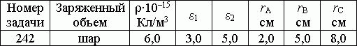 Шар из диэлектрика с диэлектрической проницаемостью ε1 радиуса R1 = 4 см заряжен по объему с постоянной объемной плотностью ρ окружен сферическим слоем диэлектрика с диэлектрической проницаемостью ε2, вплотную примыкающим к шару с внешним радиусом R2 = 7 см. Определить электрическое смещение D и напряженность Е в точках A, В и С, rA, rB, rC — расстояния от центра шара до точек A, В и С. Построить графики зависимостей D(r) и Е(r).  |