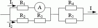 Определите общее сопротивление электрической цепи, силу тока, напряжение и мощность для каждого резистора, и общее напряжение и силу тока в цепи, если R1 = 3 Ом, R2 = 2 Ом, R3 = 4 Ом, R4 = R5 = 10 Ом. Показания амперметра 2 А.