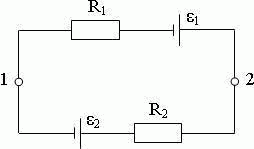 Найти разность потенциалов φ1 – φ2 между точками 1 и 2 схемы, если R1 = 10 Ом, R2 = 20 Ом, ε1 = 5 В, ε2 = 2 В. Внутренние сопротивления источника тока пренебрежимо малы.