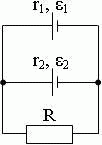 Два источника тока э.д.с. 4 и 6 В и одинаковыми внутренними сопротивлениями 4 Ом включены параллельно с резистором сопротивлением 40 м. Определить силы токов, идущих через резистор и элементы.