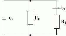 В цепи внутреннее сопротивление источников тока r1 = 1,5 Ом, r2 = 0,5 Ом, э.д.с. ε1 = 50 В, ε2 = 10 В. Найти сопротивление R1, при котором сила тока в сопротивлении R0 равна нулю.