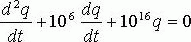 Дифференциальное уравнение колебания заряда в контуре имеет вид: . Найти: 1) время релаксации, 2) добротность контура, 3) написать уравнение изменения заряда со временем, если в начальный момент он максимален и равен 10–9 Кл. |