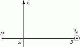 Два бесконечно длинных прямолинейных проводника расположены перпендикулярно друг другу и находятся во взаимно перпендикулярных плоскостях. Найдите напряженность магнитного поля в т.М, если I1 = 2 А, I2 = 3 A, AM = 1 см, АВ = 2 см.