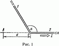 Длинный провод с током силой I = 50 А изогнут под некоторым углом α так, как показано на рис. 1. Магнитная индукция в точке А, находящейся на расстоянии d = 5 см, равна В = 34,6мкТл. Определить угол α.