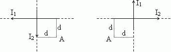 По двум бесконечным проводникам проходят токи I1 = 100A и I2 = 200A. Найти индукцию магнитного поля в т.А на расстоянии d = 10 см от проводников.