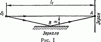 В точку A экрана от источника S1 монохроматического света длиной волны λ = 0,5 мкм приходит два луча: непосредственно от источника луч S1A, перпендикулярный экрану, и луч S1BA, отраженный в точке B от зеркала, параллельного лучу S1A (см. рис. 1). Расстояние l1 экрана от источника равно 1 м, расстояние h от луча S1A до плоскости зеркала равно 2 мм. Определить: 1) что будет наблюдаться в точке A экрана — усиление или ослабление интенсивности; 2) как изменится интенсивность в точке А, если на пути луча S1A перпендикулярно ему поместить плоскопараллельную пластинку стекла (n = 1,55) толщиной d = 6 мкм.