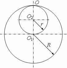 Из тонкого однородного диска радиусом R = 20 см вырезана часть, имеющая вид круга радиусом r = 10 см, так, как это показано на рисунке. Оставшаяся часть диска колеблется относительно горизонтальной оси О, совпадающей с одной из образующих цилиндрической поверхности диска. Найти период Т колебаний такого маятника.