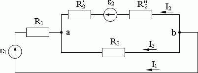 Для схемы постоянного тока и ее параметров необходимо: а) Рассчитать токи всех ветвей и показать на схеме их направления. б) Проверить 1-й закон Кирхгофа. в) Определить режимы работы источников и проверить решение по балансу мощностей. ε1 = 150 B; ε2 = 80 B; R1 = 60 Ом; R'2 = 50 Ом; R"2 = 25 Ом; R3 = 100 Ом.