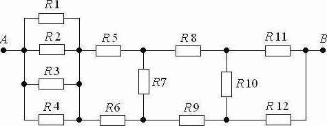 Применяя метод эквивалентных преобразований, определите сопротивление цепи между точками АВ, если резисторы имеют следующие сопротивления: R1 = 520 Ом, R2 = 82 Ом, R3 = 78 Ом, R4 = 470 Ом, R5 = 47 Ом, R6 = 127 Ом, R7 = 270 Ом, R8 = 82 Ом, R9 = 630 Ом, R10 = 56 Ом, R11 = 110 Ом, R12 = 5 Ом.