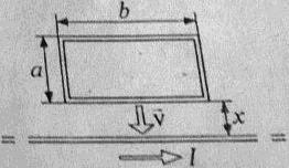 Проводящая рамка со сторонами а и b = 2a, движется равномерно со скоростью ν в направлении, перпендикулярном к бесконечно длинному параллельному проводу, лежащему в плоскости рамки параллельно стороне b. По прямому проводу идет ток I = 10 A. В момент времени, когда рамка оказалась на расстоянии х = а/2, э.д.с. εi индукции в ней достигла значения 1 мкВ. Определить скорость v рамки.