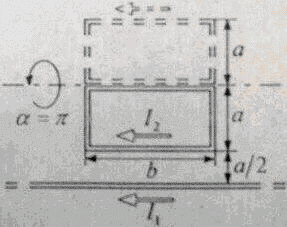 По бесконечно длинному проводу течёт ток I1 = 50 А. В одной плоскости с проводником лежит прямоугольная рамка со сторонами а = 8 см и b = 2a, в которой поддерживается постоянный ток I2. Расстояние от ближайшей к проводнику стороны рамки равно а/2. Работа, которую надо совершить, чтобы медленно (пояснить почему) повернуть рамку на угол α = π вокруг дальней относительно тока её стороны, равна 160 нДж. Определить силу тока I2 в рамке.