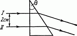 Два параллельных пучка световых волн I и II падают на стеклянную призму с преломляющим углом θ = 30° и после преломления выходят из нее. Найти оптическую разность хода Δ световых волн после преломления их призмой.