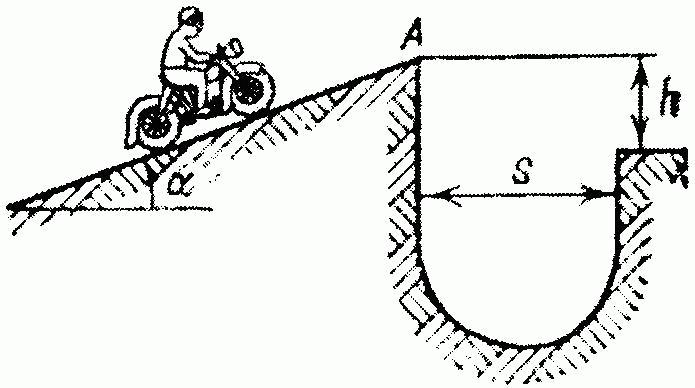Мотоциклист въезжает на высокий берег рва, параметры которого указаны на рисунке. Какую минимальную скорость v должен иметь мотоциклист в момент отрыва от берега, чтобы перескочить через ров?