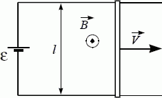 Две параллельные идеально проводящие шины замкнуты на источнике тока с Э.Д.С. ε. Расстояние между шинами l. По шинам скользит перемычка сопротивлением R. Магнитное поле индукции В перпендикулярно плоскости контура. К перемычке приложена постоянная сила, обеспечивающая движение перемычки вправо с постоянной скоростью V. Чему равна работа, совершенная источником за время τ? Внутренним сопротивлением источника пренебречь.
