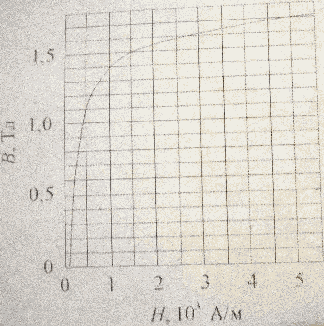 Определить индуктивность соленоида с железным сердечником и энергию магнитного поля в нем при токе 0,6 А, если сечение соленоида 10 см2, число витков 1000, а длина его 20 см. (Воспользоваться графиком B = f(H) на рисунке).