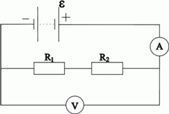 Найти показания амперметра и вольтметра в схеме на рисунке. Сопротивление вольтметра 1000 Ом, ЭДС батареи 110 В. R1 = 400 Ом, R2 = 600 Ом. Сопротивлением батареи и амперметра пренебречь.