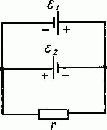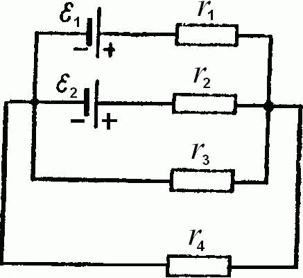 Два источника тока ε1 = 12 В с внутренним сопротивлением r1 = 4 Ом и ε2 = 8 В с внутренним сопротивлением r2 = 2 Ом, а также реостат r = 20 Ом соединены, как показано на рисунке. Определить силы тока в реостате и в источниках тока.