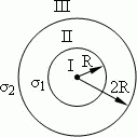 На двух концентрических сферах радиусами R и 2R равномерно распределены заряды с поверхностными плотностями σ1 = 120 нКл/м2 и σ2 = 30 нКл/м2 (рис. 1). Используя теорему Остроградского – Гаусса, найти зависимость Е(r) напряженности электрического поля от координаты для трех областей: I, II и III. Вычислить напряженность Е электрического поля в точке, удаленной от центра на расстояние r = 1,5R, и указать направление вектора Е. Построить график зависимости Е(r).