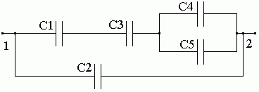 Найти электрическую емкость следующей батареи конденсаторов между точками 1-2, если C1 = 4 мкФ; C2 = 1 мкФ; C3 = 4 мкФ; C4 = 1 мкФ; C5 = 1 мкФ.