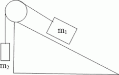 В установке (рис.3) угол α = 50° наклонной плоскости с горизонтом массы тел m1 = 0,15 кг и m2 = 0,5 кг. Считая нить и блок невесомыми, и пренебрегая силами трения, определите ускорение, с которыми будут двигаться тела, если тело массой m2 опускается.
