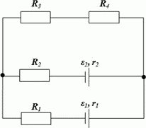 Определите силу токов, протекающих через сопротивления и через источники. Внутреннее сопротивление источников не учитывать. ε1 = 40 B, ε2 = 30 B, R1 = 30 Ом, R2 = 10 Ом, R3 = 15 Ом, R4 = 30 Ом.