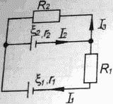 Найти силы тока во всех участках цепи (рис. 10), если ξ1 = 20 В, ξ2 = 33 В, r1 = 0,2 Ом, r2 = 0,5 Ом, R1 = 0,8 Ом, R2 = 2 Ом.