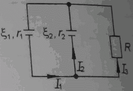Два источника с ЭДС ξ1 = 30 В, ξ2 = 16 В и внутренними сопротивлениями r1 = 1 Ом, r2 = 2 Ом включены параллельно (рис. 11) и работают на общую нагрузку сопротивлением R = 25 Ом. Определить силы тока во всех ветвях и мощность, потребляемую нагрузкой.