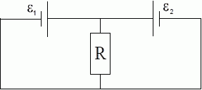 Два источника тока: ε1 = 14 В с внутренним сопротивлением r1 = 2 Ом и ε2 = 6 В с внутренним сопротивлением r2 = 4 Ом соединены, как это показано на рисунке. Определить силы токов в реостате и источниках тока. Сопротивление реостата R = 100 Ом.