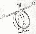 Кольцо из алюминиевой проволоки сечением S = 2 мм2 может свободно вращаться вокруг горизонтальной оси OO'. Вертикально вверх направлено однородное магнитное поле (B = 20 мТл). Определить угол α, на который отклонится плоскость кольца, если по нему пропустить ток I = 5 А. Плотность алюминия ρ = 2,7·103 кг/м3.
