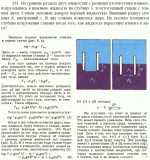 На границе раздела двух жидкостей с разными плотностями плавает, погрузившись в нижнюю жидкость на глубину h, толстостенный стакан с тонким дном. Стакан заполнен доверху верхней жидкостью. Внешний радиус стакана R, внутренний r. В дне стакана появилась дыра. На сколько изменится глубина погружения стакана после того, как жидкость перестанет втекать в него? |