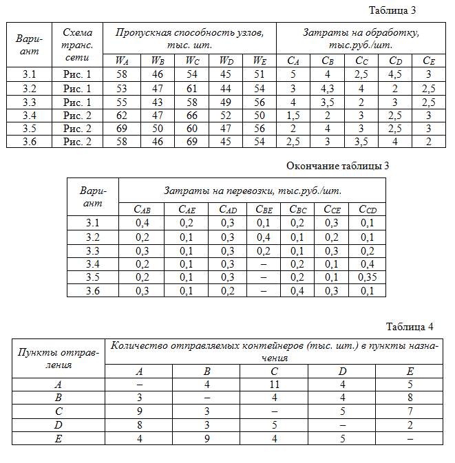 Дано: количество контейнеров, подлежащих отправке из пункта А в другие пункты: QAB, QAC, QAD, QAE; из пункта В – QBA, QBC, QBD, QBE, ана-логично для пунктов С, D, Е; пропускная способность узлов WI, затраты на обработку одного контейнера в узлах Ci и затраты на перевозки между пунктами Cij, которые не зависят от направления перевозки.