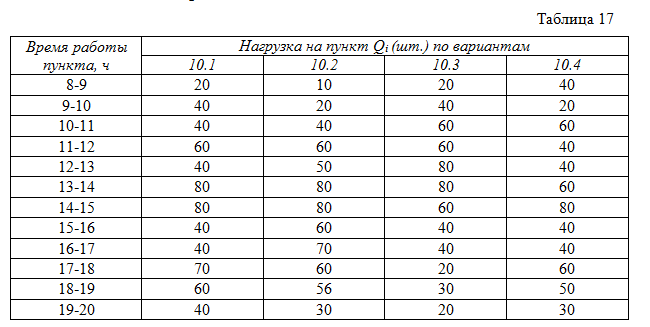В вариантах 10.1–10.2 показать, что повлечет за собой замена условия 1 на следующее: нагрузка на пункт – величина случайная, распределенная по нормальному закону; при этом величину Qi следует рассматривать как математическое ожидание нагрузки, а среднеквадратическое отклонение σi = 0,1Qi; вероятность обслуживания в каждый час должна быть не ниже P. Получить решения для трех значений P: 0,7; 0,8 и 0,9.