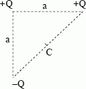 Найти напряженность поля в точке С, расположенной на середине гипотенузы. В вершинах треугольника помещены заряды |Q| = 1,0·10–9 Кл, длина гипотенузы 0,1 м.