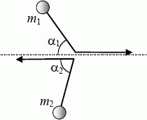 Две шайбы в результате столкновения на гладком горизонтальном столе разлетелись в противоположных направлениях, как показано на рисунке. Во сколько раз отличались скорости шайб перед столкновением, если известны их массы m1, m2 и углы α1, α2?