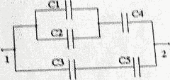 Найти электрическую емкость следующей батареи конденсаторов между точками 1-2, если С1 = 0,5 мкФ, С2 = 0,5 мкФ, С3 = 2 мкФ, С4 = 1 мкФ, С5 = 2 мкФ.