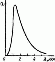 На рисунке дана кривая зависимости спектральной плотности энергетической светимости абсолютно черного тела rλ от длины волны λ при некоторой температуре. К какой температуре T относится эта кривая? Какой процент излучаемой энергии приходится на долю видимого спектра при этой температуре? ![]()